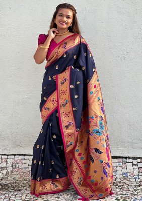 Navy Blue Zari Woven Paithani Silk Saree Set